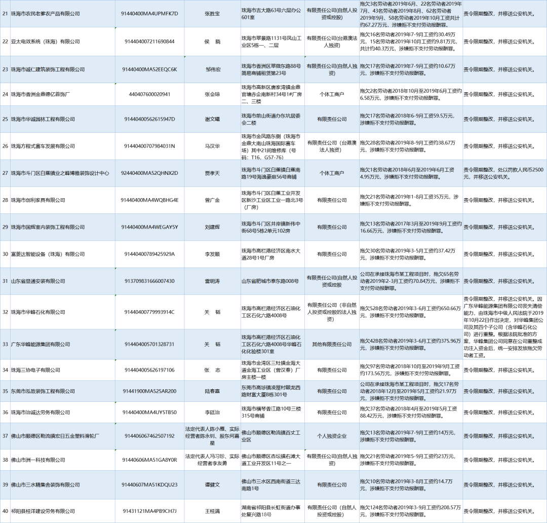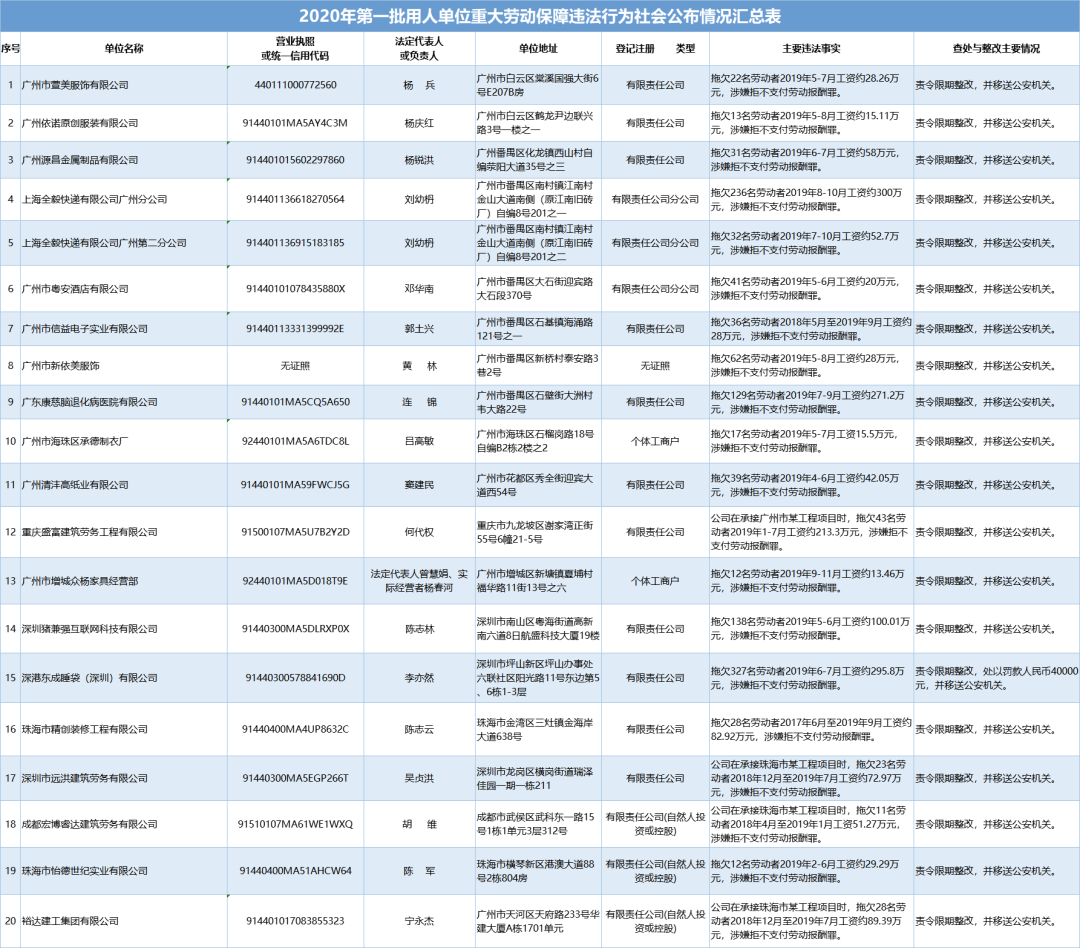 為加強(qiáng)對(duì)違法用人單位的社會(huì)監(jiān)督,強(qiáng)化誠(chéng)信體系建設(shè),加大威懾力,依據(jù)《廣東省用人單位重大勞動(dòng)保障違法行為社會(huì)公布暫行規(guī)定》,省人社廳公布2020年第一批重大違法案件,涉及81家企業(yè),其中深圳豬兼強(qiáng)互聯(lián)網(wǎng)科技有限公司拖欠138名勞動(dòng)者2019年5-6月工資約100.01萬元,涉嫌拒不支付勞動(dòng)報(bào)酬罪,被責(zé)令限期整改,并移送公安機(jī)關(guān)。深港東成睡袋(深圳)有限公司拖欠327名勞動(dòng)者2019年6-7月工資約295.8萬元,涉嫌拒不支付勞動(dòng)報(bào)酬罪,被責(zé)令限期整改,處以罰款人民幣4萬元,并移送公安機(jī)關(guān)。