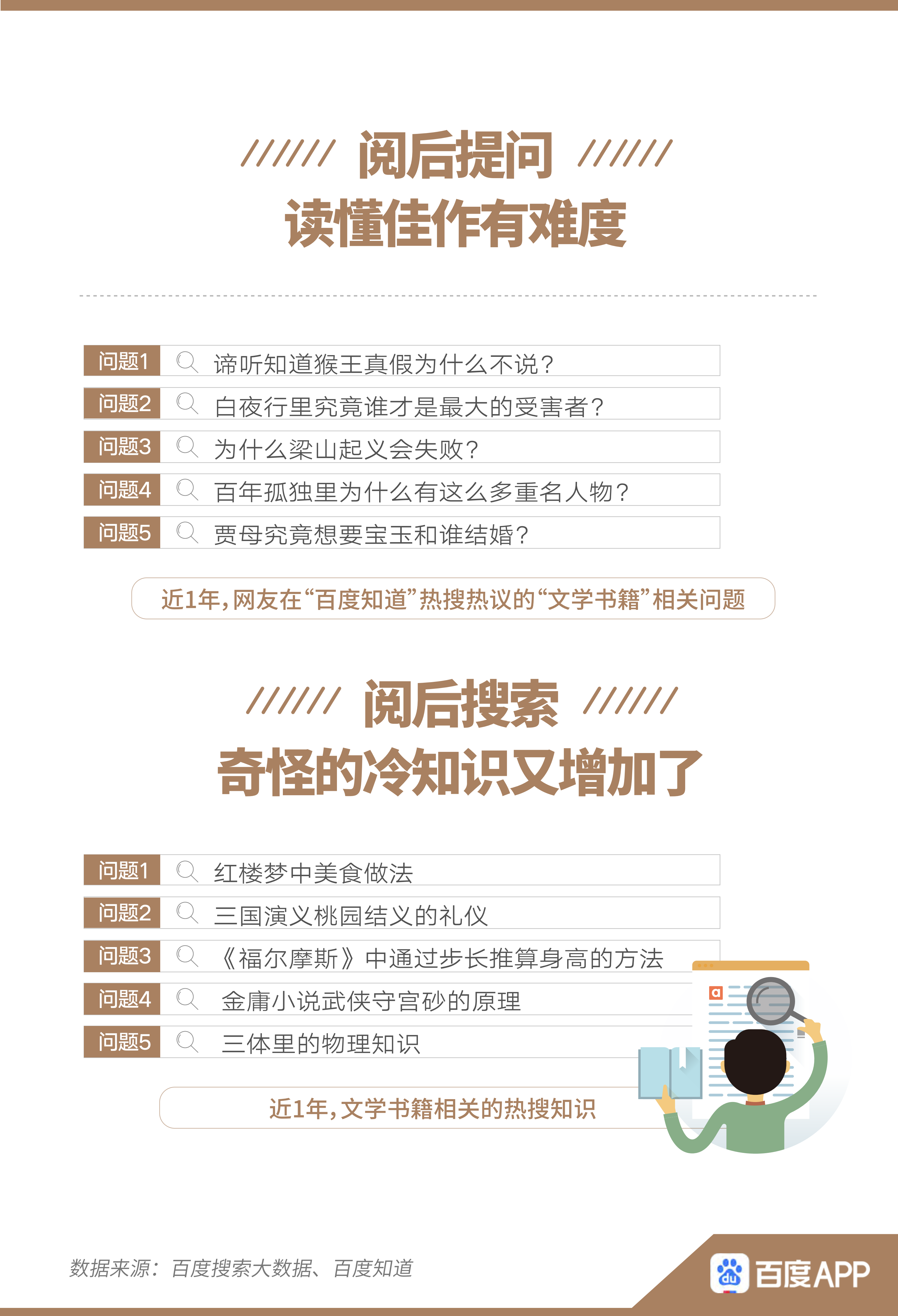 閱后提出對(duì)書籍的疑惑、討論思考、參與表達(dá),均是讀者的重要需求。報(bào)告顯示,近1年,不少網(wǎng)友在閱讀之后,選擇到百度知道提問(wèn)、討論。例如,“諦聽知道猴王真假為什么不說(shuō)”、“白夜行究竟誰(shuí)是最大受害者”等情節(jié)相關(guān)問(wèn)題,均引起網(wǎng)友的熱搜熱議。除此之外,在百度搜索與主要情節(jié)無(wú)關(guān)的“冷”知識(shí)的人也不在少數(shù),如“紅樓夢(mèng)中美食做法”、“三體里的物理知識(shí)”等。