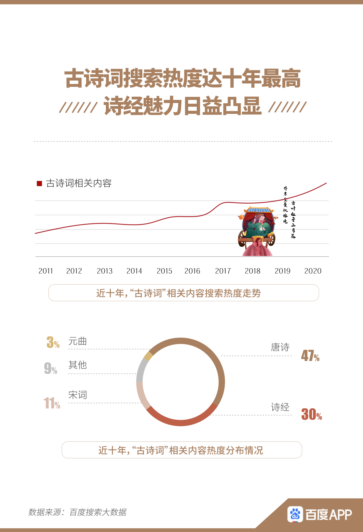 事實(shí)上,“四大名著”熱度年勝一年的背后,是人們對(duì)傳統(tǒng)文化的熱愛(ài)日益提升。這也反映在古詩(shī)詞的搜索熱度之上。報(bào)告顯示,古詩(shī)詞搜索熱度逐年攀升,在2020年達(dá)十年最高。詩(shī)經(jīng)越來(lái)越多地出現(xiàn)在人們視野之中,搜索熱度占比30%。