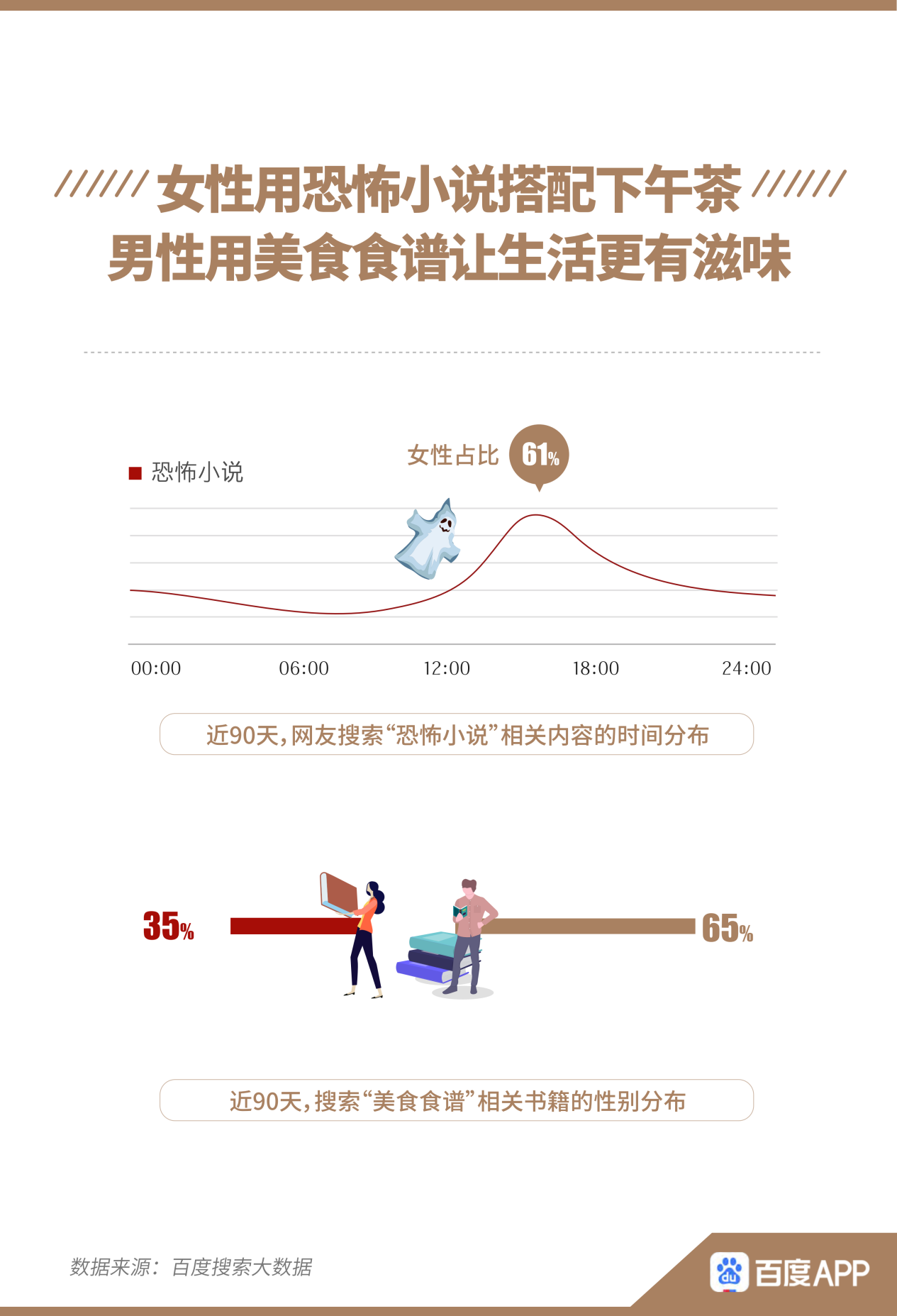 與往常印象相反,搜索“恐怖小說(shuō)”相關(guān)內(nèi)容的人群中,女性比男性更多,占比61%,下午15時(shí)是搜索的高峰時(shí)間。而男性更關(guān)注“美食食譜”相關(guān)書籍,在搜索相關(guān)書籍的人群中占比65%。