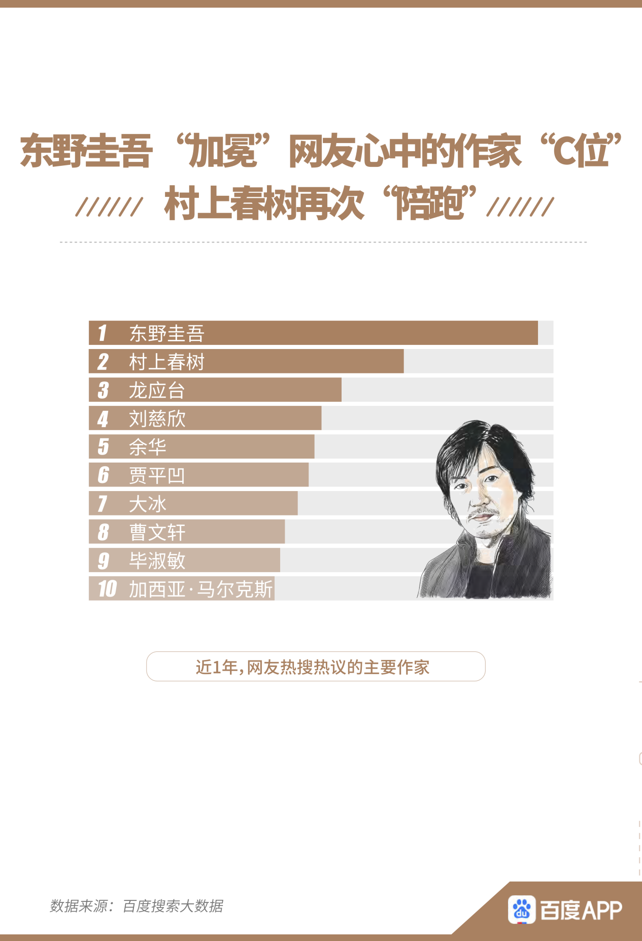 經(jīng)典深入人心,也無(wú)礙閱讀世界百家爭(zhēng)鳴。報(bào)告盤點(diǎn)了近1年網(wǎng)友熱搜熱議的主要作家,推理小說(shuō)家東野圭吾占熱度C位,村上春樹位居第二,再“陪跑”。