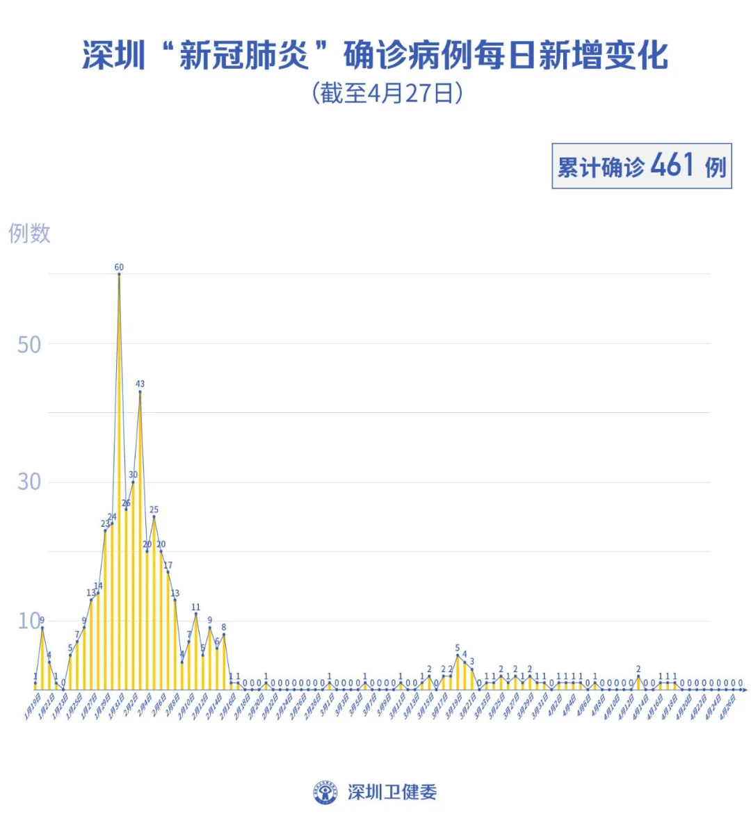 截至4月27日24時,深圳累計報告新冠肺炎病例461例。4月27日當(dāng)天新增無癥狀感染者1例,出院1例。
