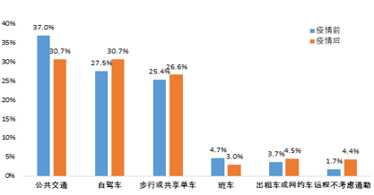 調(diào)查顯示,市民選擇公共交通方式的比例從疫情前的約37%下降至約30%,選擇私人小汽車(chē)的從27.5%上升至30.7%,選擇步行、自行車(chē)等慢行方式的從25.4%上升至接近27%。疫情過(guò)后,市民出行選擇公共交通的比例有所下降,小汽車(chē)和風(fēng)險(xiǎn)更低,更私密、更獨(dú)立的慢行交通方式成為偏好選擇。