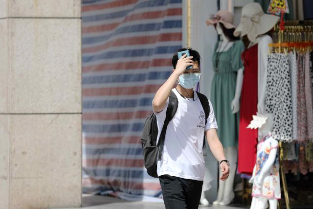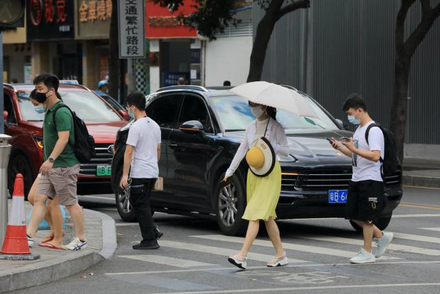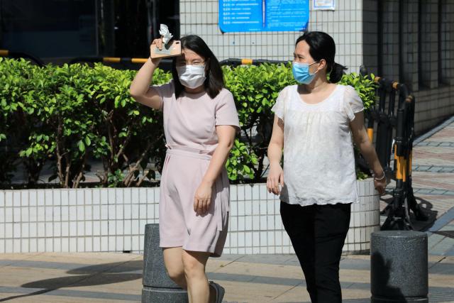 ▲走在街上,熱浪撲面而來,耀眼的陽光把人曬得睜不開眼,行人紛紛拿起手頭物品遮擋烈日。