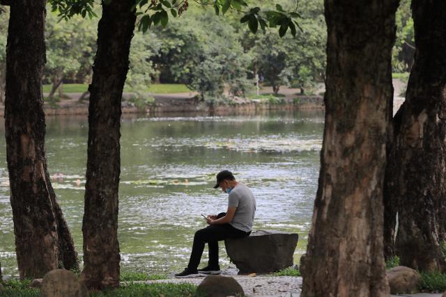 ▲市民在公園的樹下乘涼。