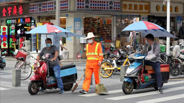 ▲保潔員戴著遮陽帽在街頭忙碌。