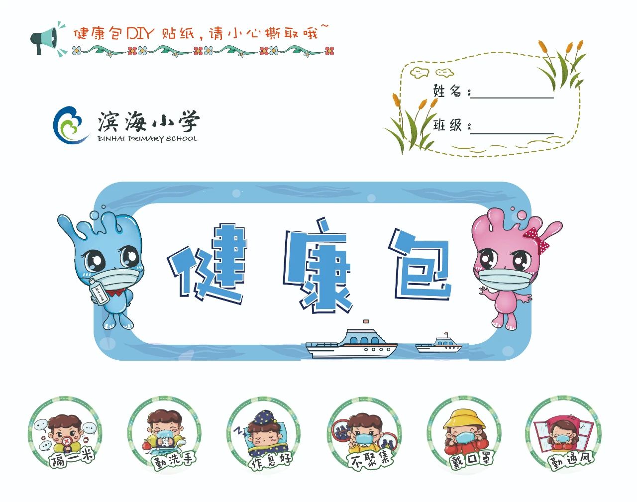 《健康包》,也是學(xué)校精心為返校的學(xué)生準(zhǔn)備的一份健康防疫小禮包,里面有臂貼、DIY貼紙等!這些萌萌的DIY貼紙,可以根據(jù)孩子們的個(gè)性需求和遵守情況,自由拼貼!學(xué)校通過這些充滿童趣的設(shè)計(jì),讓孩子們將防護(hù)措施牢記于心!