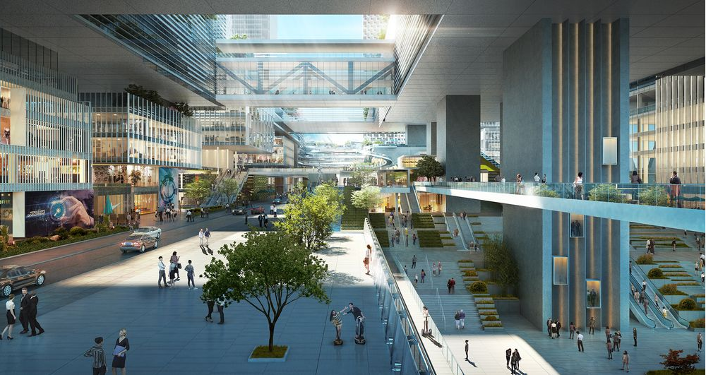 地表層連接城市交通,匯聚人流。在本項(xiàng)目中,它集合了交通樞紐、辦公空間和實(shí)驗(yàn)室、商業(yè)街以及會(huì)議中心等多種功能。平臺(tái)位于地表層上方30米的高度,既可保證最大化的采光,又為下方空間提供了一個(gè)舒適遮雨的環(huán)境。