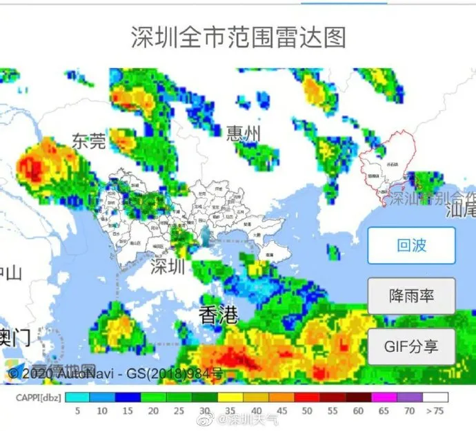 【深圳市分區(qū)暴雨黃色預(yù)警】預(yù)計(jì)福田區(qū),羅湖區(qū),南山區(qū),鹽田區(qū),大鵬新區(qū),西部海區(qū),東部海區(qū),寶安區(qū)(新安、西鄉(xiāng)、航城街道),龍崗區(qū)(南灣、坂田、園山、橫崗、布吉、吉華街道),龍華區(qū)(民治街道)和坪山區(qū)(馬巒、碧嶺街道)1-2小時內(nèi)將出現(xiàn)20-40毫米降水,深圳市氣象臺于2020年05月18日15時50分在上述地區(qū)發(fā)布暴雨黃色分區(qū)預(yù)警,全市進(jìn)入暴雨戒備狀態(tài),請注意防范。