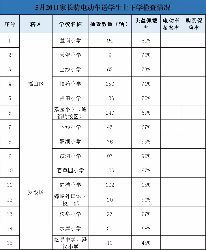 5月20日,深圳交警在全市范圍內(nèi)選取了70所學(xué)校進(jìn)行抽查,共5037輛電動(dòng)車(chē)被查,頭盔佩戴率達(dá)89%。其中松泉中學(xué)、筍崗小學(xué)、西麗學(xué)校、福華學(xué)校頭盔佩戴率不足一半。