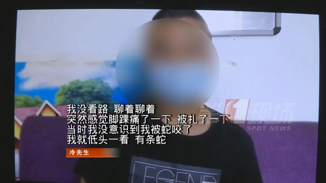 5月21日晚上7點(diǎn)多,市民冷先生和家人吃完晚飯后,獨(dú)自來到位于坑梓的五馬峰公園散步。他一邊散步一邊跟朋友視頻聊天。剛走沒多久,冷先生突然感覺自己的右腳有點(diǎn)不對(duì)勁,有被扎了一下的感覺。他低頭一看,原來是被蛇咬傷了。