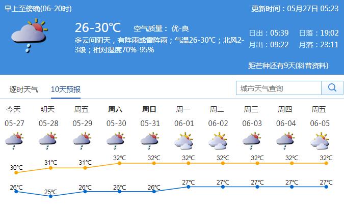 市氣象臺(tái)預(yù)測(cè),27日-31日多云天氣為主,部分時(shí)間有陣雨或雷陣雨,氣溫逐日升高,天氣轉(zhuǎn)熱。