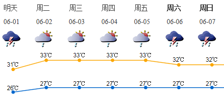 6月1日有雷陣雨,局部暴雨,季風(fēng)降雨易出現(xiàn)在早晨到上午時(shí)段,氣溫26-31℃。