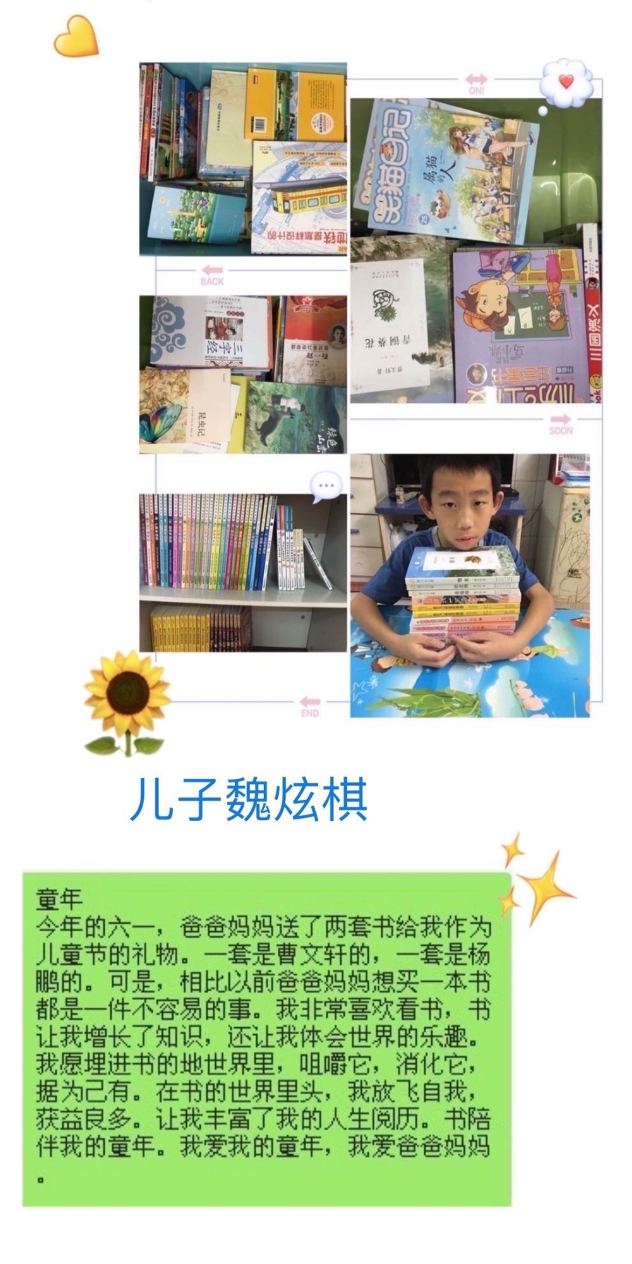 今年的六·一讓人難忘,在我們祖國經(jīng)歷了重大疫情重創(chuàng)后,我們還能擁有如此豐富多彩的六·一活動,收到超多的美食,還有玩具,每個(gè)人都共同參與節(jié)目表演,老師和同學(xué)們在一起歡歌笑語,收獲終生難忘的記憶。感謝偉大的逆行者們!感恩學(xué)校老師們的精心策劃安排,讓我們過了一個(gè)這么有特色的自主六·一兒童節(jié)!