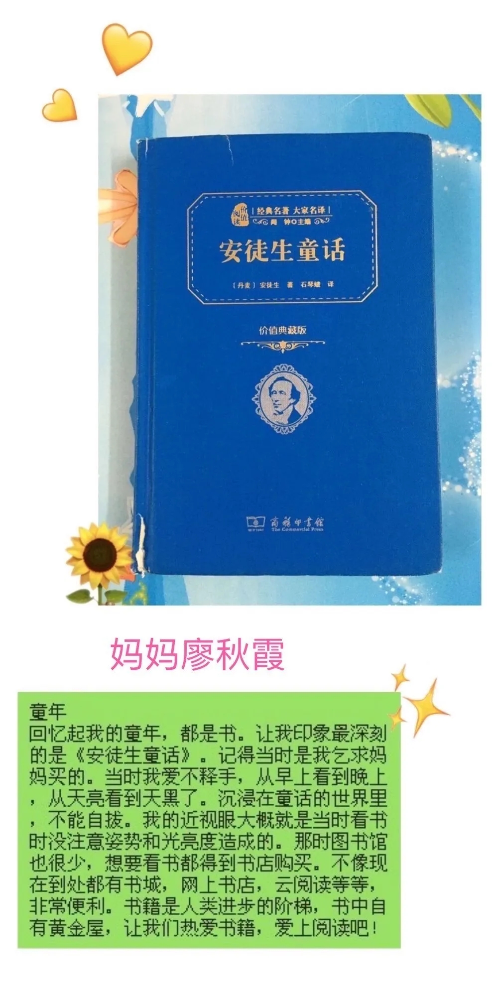在這快樂的節(jié)日里,我也讓媽媽和我分享了她記憶中的六·一,她好好思考了一會兒說:"還是非常巧的,記憶最深的六·一,也是和你同歲的那一年,那是我在重慶老家過的最后一個(gè)六·一。記得當(dāng)日穿上了最漂亮的衣服,戴上了紅領(lǐng)巾,早早就去了學(xué)校,在簡單的慶祝活動后,就由老師帶領(lǐng)成績優(yōu)秀的同學(xué)到公社的禮堂去看慶祝表演活動,從學(xué)校走到公社要一個(gè)多小時(shí),大家一邊走一邊唱《快樂的節(jié)日》,非常的歡樂,感覺自己好似真的變成小鳥了,在會場里每位同學(xué)都收到了一個(gè)驚喜的小禮包,三十幾年過去現(xiàn)在回想起來快樂的感覺仍很深刻!好似六·一的感覺就停頓在那個(gè)時(shí)候,后來在深圳過的六·一印象反而都模糊了?!?/p>