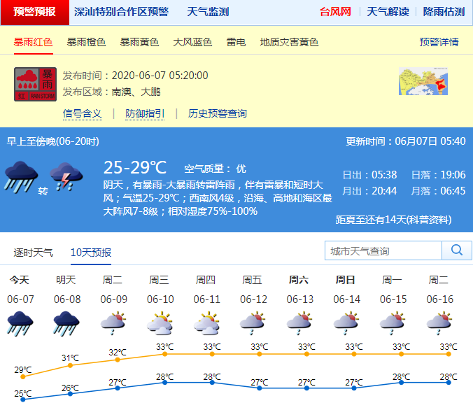 【06-07 05:25 】過去2小時,南澳、大鵬街道累計(jì)雨量已達(dá)大暴雨,預(yù)計(jì)強(qiáng)降雨還將持續(xù)1-2小時,深圳市氣象臺在南澳、大鵬街道發(fā)布暴雨紅色分區(qū)、大風(fēng)藍(lán)色分區(qū)、雷電預(yù)警,全市進(jìn)入暴雨緊急防御狀態(tài),請迅速做好防御工作。用人單位視情況安排工作人員推遲上班、提前下班或者停工。