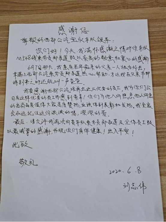 見(jiàn)圳客戶端·深圳新聞網(wǎng)2020年6月9日訊(深圳特區(qū)報(bào)記者 徐興東)6月9日早上,一位自稱(chēng)劉先生的年輕人冒著滂沱大雨來(lái)到了西部公汽寶永車(chē)隊(duì)。一進(jìn)辦公室,劉先生雙手捧著將親筆寫(xiě)的一封感謝信呈給了隊(duì)助張喜鳳,并深有感觸地說(shuō)道:“多災(zāi)多難的父親有幸遇到乘務(wù)員鄭錄蓮的熱心幫助,并想方設(shè)法聯(lián)系上我。謝謝你們的成全,才讓我在父親節(jié)即將到來(lái)之時(shí)還能叫一聲爸爸,我將終生銘記諸位的大恩大德!”樸實(shí)無(wú)華的話語(yǔ),感染了在場(chǎng)的每一個(gè)人,分明看出個(gè)個(gè)眼里都閃爍著晶瑩的喜悅淚花。