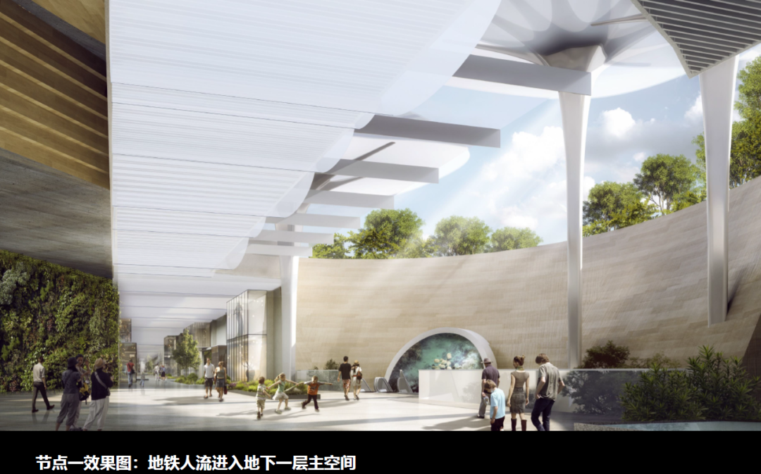 穿過洞穴般的地鐵出口,景象瞬間開闊,陽光透過構(gòu)筑物和煦的灑下,伴著兩側(cè)綠植和藝術(shù)墻緩緩升到負一層,達到商業(yè)線性軸和藝術(shù)通道的交匯處。
