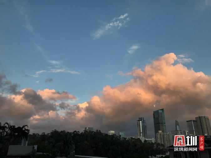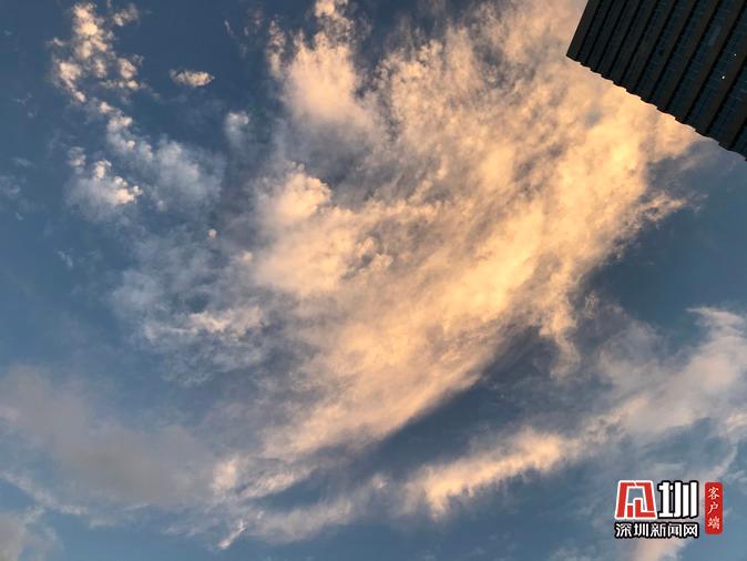 下午19點(diǎn),夕陽將云朵染成橙色。