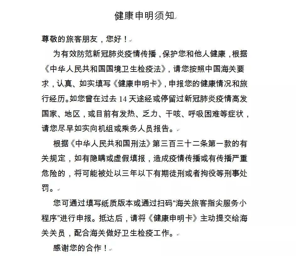 一、請(qǐng)?zhí)崆跋螺d打印《健康申明卡》(見(jiàn)附件1),或關(guān)注“海關(guān)旅客指尖服務(wù)小程序”(見(jiàn)附件2)。提前如實(shí)填寫(xiě)紙質(zhì)或電子健康申報(bào)信息,通關(guān)時(shí)主動(dòng)向海關(guān)申報(bào)。