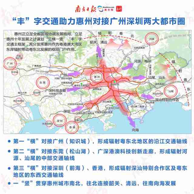 陳鴻宇舉例說(shuō),介于廣深兩大都市圈之間的惠州,大手筆規(guī)劃“豐”字交通主框架,向西分別對(duì)接廣州、東莞、深圳,向東輻射河源、汕尾等地,向北則連接韶關(guān)、清遠(yuǎn)。類似這樣,各城市可緊密對(duì)接,推進(jìn)更多跨城市、跨都市圈的合作。