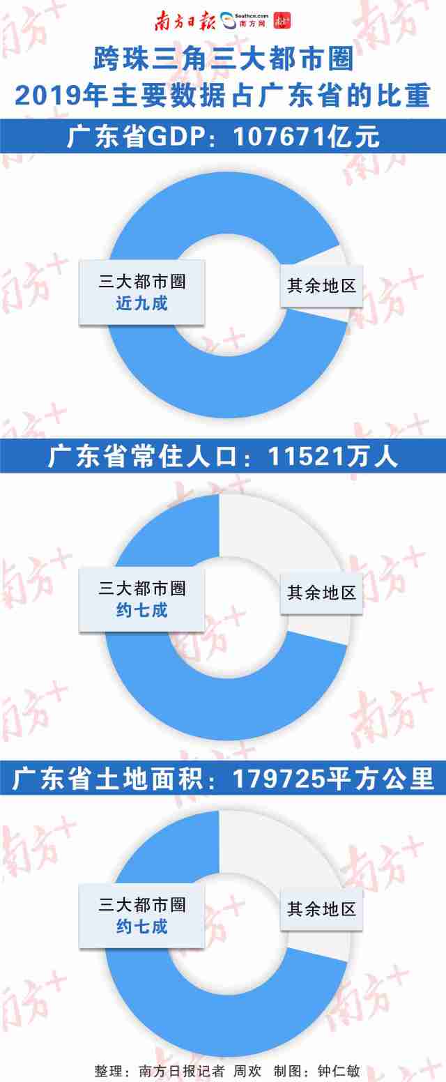 南方城市智庫(kù)梳理發(fā)現(xiàn),去年廣州、深圳、珠江口西岸三大都市圈的經(jīng)濟(jì)總量超過(guò)9萬(wàn)億元,占全省近九成;常住人口、土地面積均占全省約七成。