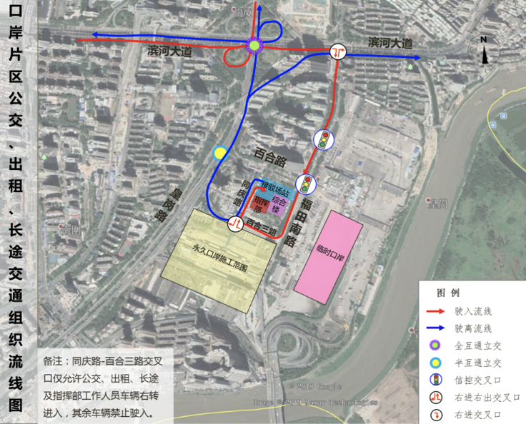 臨時口岸期間機動車交通按照“流線順暢、客貨分離、人車分離”的原則進行組織。主要利用口岸片區(qū)的皇崗路、百合路、福田南路、同慶路等進行組織。各交通方式交通組織流線圖如下: