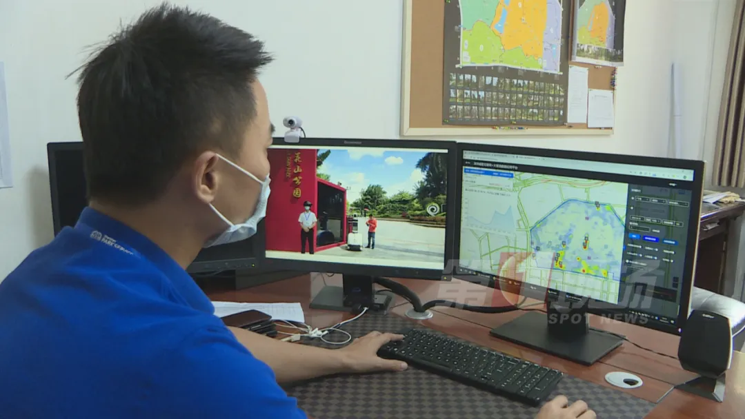 在蓮花山公園的南門口,安保人員戴著一頂智能頭盔,入園游客的體溫,可以實時顯示在眼前的屏幕上,一旦溫度達到37.3℃,就會發(fā)出警報。如果游客沒有戴口罩,門口的智能機器人也會提醒:“請您戴上口罩”。