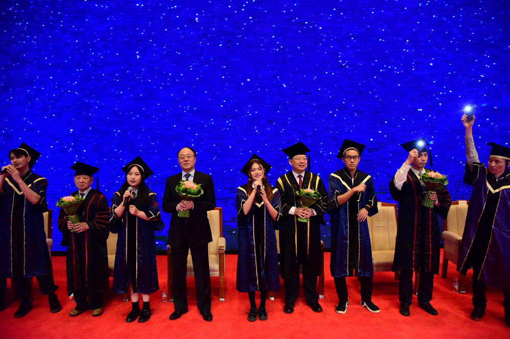 今天這場典禮和以往有些不同:許多朝夕相處的同學(xué)還沒來得及互道珍重,就已經(jīng)各奔前程。前些日子,我爬遍了深圳十大名山,本想以最fit的狀態(tài)為全體畢業(yè)生一一頒授學(xué)位,無奈事與愿違。作為校長,不能在重要時刻與大家逐一同框,讓我十分遺憾。即便如此,學(xué)校還是堅持按往年的規(guī)格為畢業(yè)生代表舉行這場儀式,希望盡可能讓大家在特殊的年份感受母校給予的溫暖和信心。沒來現(xiàn)場的家長、同學(xué)可以通過直播參與典禮。此刻,近萬名畢業(yè)生,近萬個家庭和全社會所有關(guān)心支持你們的人都在刷屏、點贊、發(fā)彈幕,我提議,讓我們用掌聲把共鳴打在公屏上!