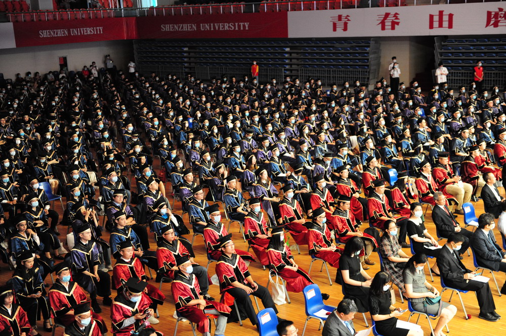 上午9時,畢業(yè)典禮在莊嚴(yán)的國歌聲中拉開了帷幕。據(jù)介紹,2020年深圳大學(xué)畢業(yè)研究生數(shù)量創(chuàng)歷史新高,達(dá)到2334名,包括44位博士學(xué)位獲得者,2290位碩士學(xué)位獲得者。其中,郭奎奎等20人獲得廣東省優(yōu)秀學(xué)生稱號,李豪道等140人榮獲國家獎學(xué)金,曾吉申等64人榮獲鵬城獎學(xué)金、騰訊創(chuàng)新獎學(xué)金。