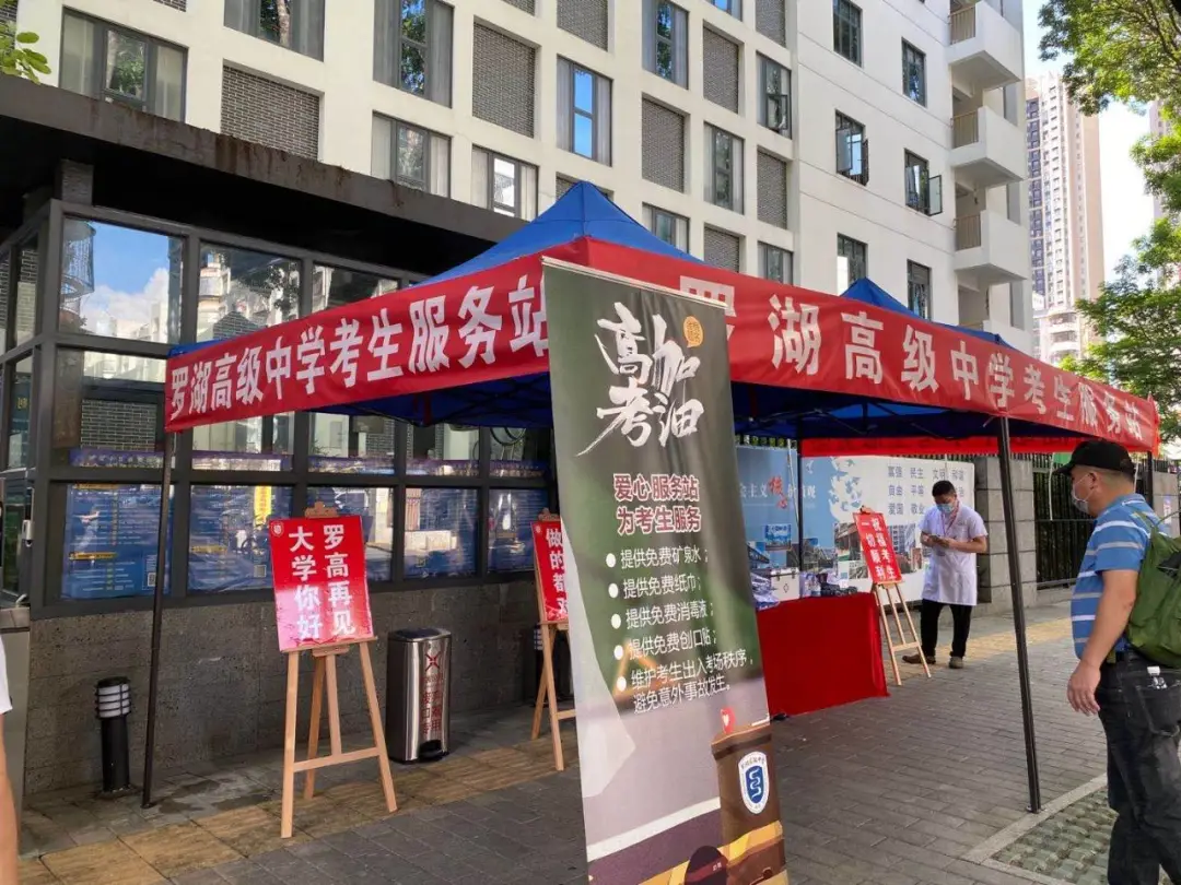在羅湖高級(jí)中學(xué),記者看到,在校門口右側(cè),設(shè)置了服務(wù)站,里面為考生準(zhǔn)備了校服、文具、防疫用品、雨傘、紙巾、水等。