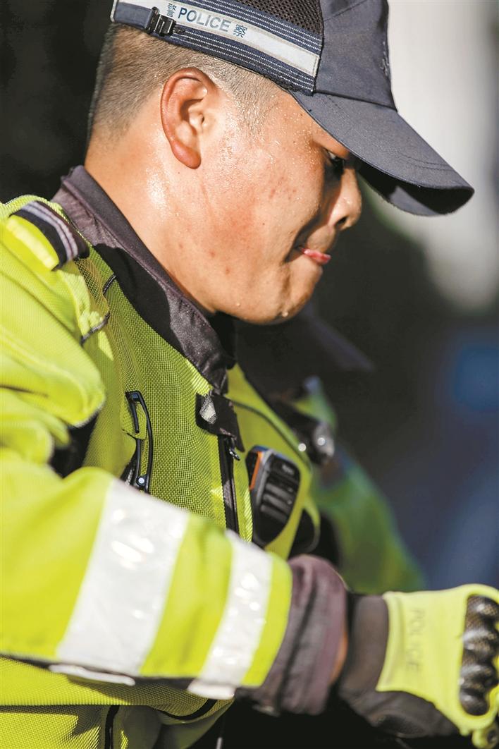 “深圳最近的天氣太熱了,到了中午,地面溫度估計(jì)得有40℃了,我們因?yàn)榇髦谡郑忸^還得加上頭盔,感覺確實(shí)挺難受的?!鄙钲诮痪仙酱箨?duì)機(jī)訓(xùn)中隊(duì)的鐵騎小哥時(shí)云財(cái),每天早高峰開始就駕駛鐵騎穿梭在大街小巷,直到中午太陽最盛的時(shí)候。摘下頭盔,眼睫毛上都是汗滴,更不用說脫下熒光黃的制服,里面是層層疊疊早已被浸透發(fā)白的衣衫。