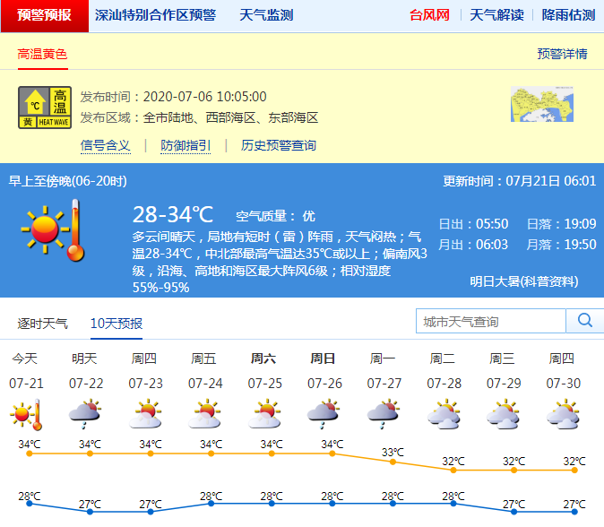 見(jiàn)圳客戶(hù)端·深圳新聞網(wǎng)2020年7月21日訊 今日多云間晴天,局地短時(shí)雷陣雨;氣溫28-34℃,中北部可達(dá)35℃以上;偏南風(fēng)3級(jí),沿海、高地和海區(qū)最大陣風(fēng)6級(jí);濕度55%-95%。22日晴天間多云,局地短時(shí)陣雨。23-27日,天氣悶熱,局地短時(shí)陣雨。深圳市氣象臺(tái)20日16時(shí)發(fā)布