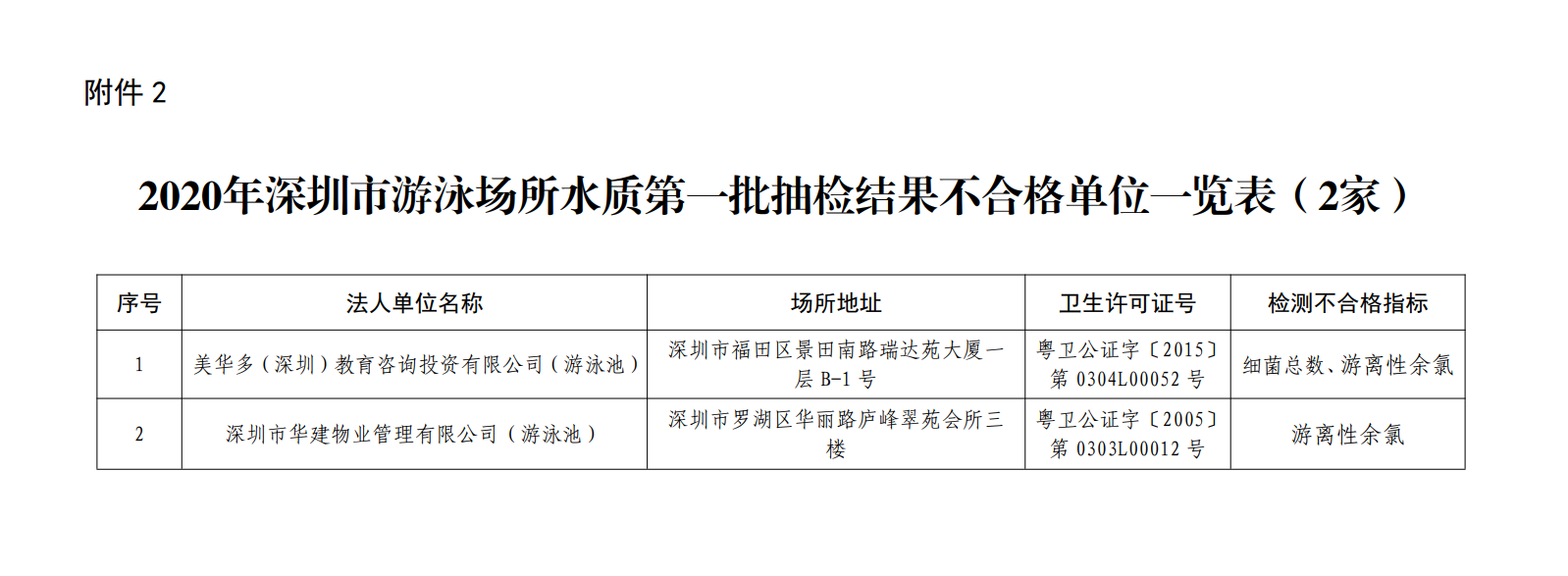 2020年深圳市游泳場所水質(zhì)第一批抽檢結(jié)果不合格單位一覽表(2家)