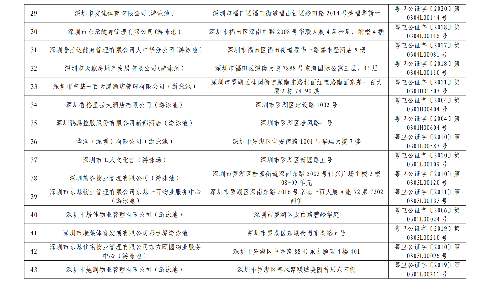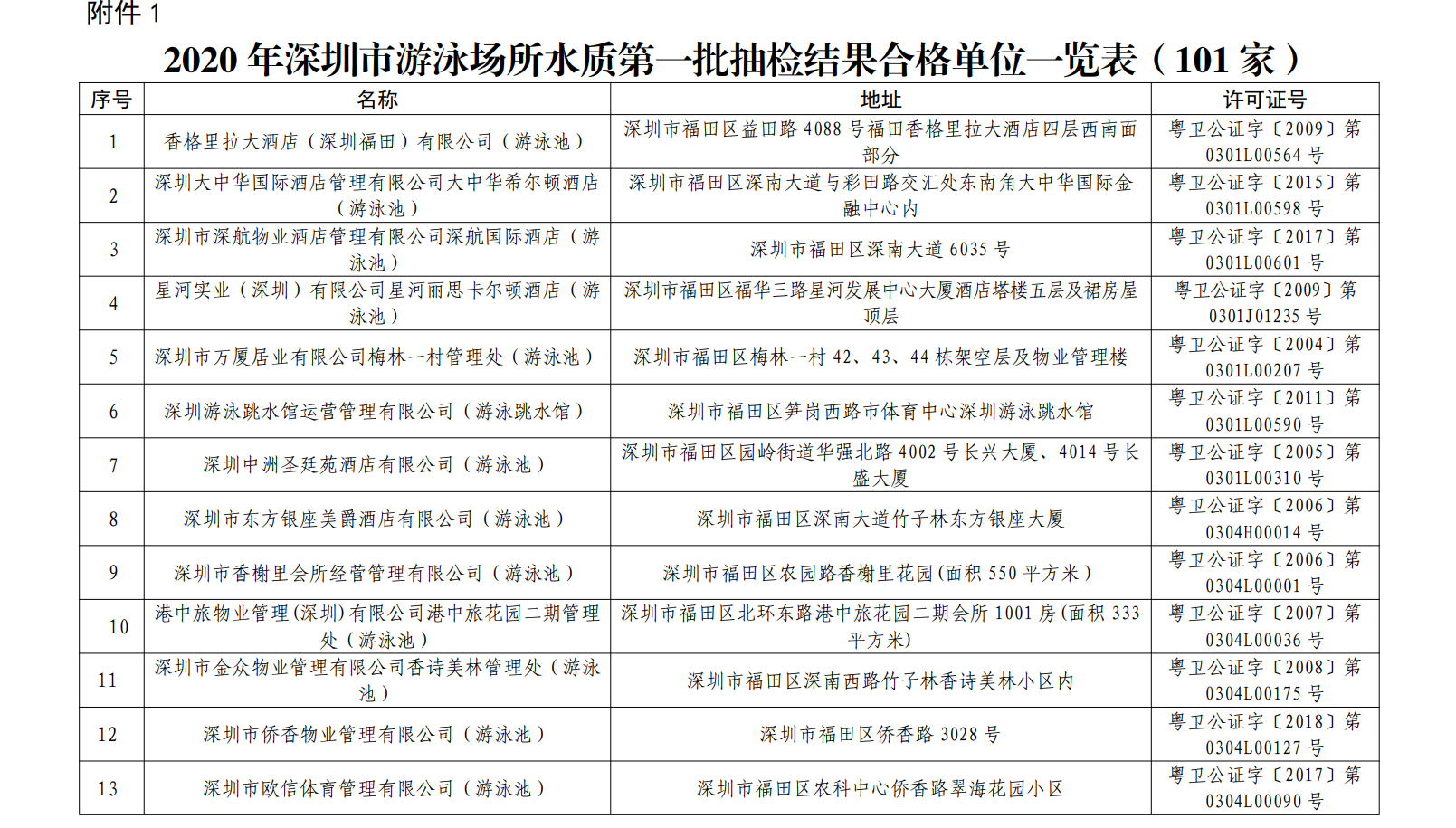 2020年深圳市游泳場所水質(zhì)第一批抽檢結(jié)果合格單位一覽表(101家)
