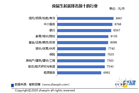 報告顯示,應(yīng)屆生起薪排名前十的行業(yè)中,信托/擔(dān)保/拍賣/典當(dāng)、中介服務(wù)、銀行等行業(yè)為起薪排名前三名,分別為8961元,8768元和8597元。除此之外,教育/培訓(xùn)/院校、娛樂/體育/休閑等受益于直播經(jīng)濟(jì)的帶動和數(shù)字化的發(fā)展,也向應(yīng)屆生開出了相對高的薪酬。