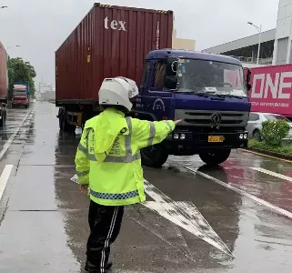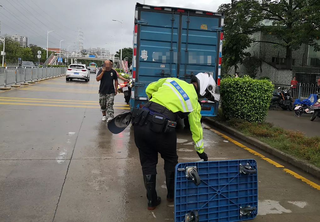 8月5日9時(shí)30分許,深圳交警鐵騎隊(duì)員雨中巡邏至新沙路時(shí),發(fā)現(xiàn)德昌電機(jī)廠路段有一輛貨車(chē)停在路上,導(dǎo)致交通擁堵。貨車(chē)司機(jī)在旁,鐵騎上前詢(xún)問(wèn)情況后得知貨車(chē)故障,司機(jī)被迫將車(chē)停在路邊。