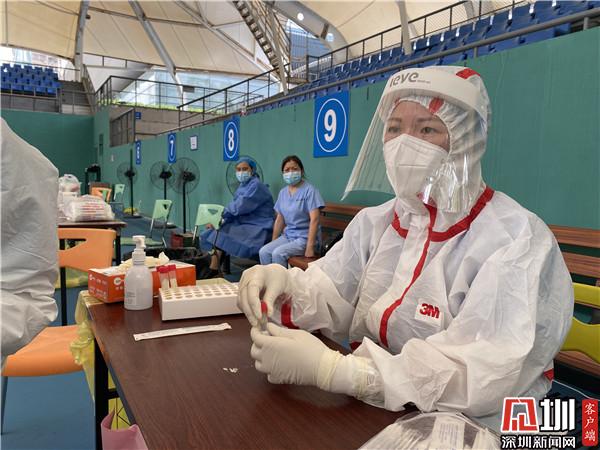 為提高轄區(qū)核酸檢測效率,羅湖區(qū)在羅湖區(qū)體育館搭建了臨時(shí)檢測點(diǎn),主要為轄區(qū)農(nóng)貿(mào)市場、商超、KTV等重點(diǎn)行業(yè)從業(yè)人群進(jìn)行核酸檢測。5月30日上午,記者來到羅湖區(qū)體育館網(wǎng)球館,只見一排的采樣作業(yè)臺(tái)有序排開,一米之外,是秩序井然的排隊(duì)人員。一張小小的采樣臺(tái),搭配兩名醫(yī)護(hù)人員,他們身穿防護(hù)服、頭戴防護(hù)罩,一名取集樣本、一名放置樣本,一個(gè)采樣流程下來不到兩分鐘,現(xiàn)場井然有序。烈日下,他們的汗水沿著防護(hù)罩流下來,厚重的防護(hù)服下,支撐他們的是堅(jiān)守一線的責(zé)任感和使命感。