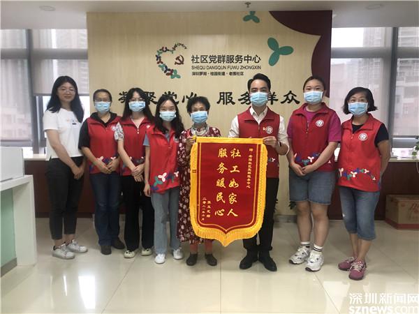 讀特客戶端·深圳新聞網(wǎng)2021年6月28日訊(記者 劉嘉敏 通訊員 楊紀(jì)歐)6月28日上午,79歲的社區(qū)居民張玉芝冒雨來(lái)到羅湖區(qū)桂園街道老圍社區(qū)黨群服務(wù)中心,將一面金光閃閃的錦旗,交到老圍社區(qū)黨委副書記黃小龍的手中。錦旗上兩行金光閃閃的大字格外醒目:“社工如家人,服務(wù)暖民心?!?/p>