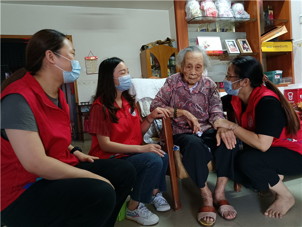 在鐘錦云老人家里,85歲的鐘阿姨挨個跟年輕的社工握手,一口一個乖女,笑著說:“你們真乖啊,又來看鐘姨了,謝謝你們啊。”這兩年,社工經(jīng)常登門看望,她總是喜歡叫社工乖女,與社工談笑間親如家人。社工轉(zhuǎn)達了社區(qū)黨委對老人的問候,并祝老人中秋快樂。分別時,老人不舍地將大家送到樓梯間,一再叮囑有空就來玩。