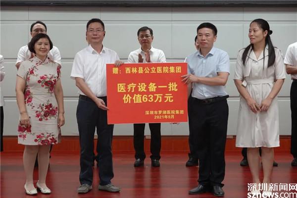 鄉(xiāng)村振興,關(guān)鍵在人,醫(yī)療和教育等基礎(chǔ)設(shè)施同樣起不可或缺的作用。此次考察中,羅湖區(qū)向西林縣人民醫(yī)院捐贈了一批醫(yī)療設(shè)備。據(jù)了解,自2017年對口幫扶西林縣以來,羅湖區(qū)共派出8批醫(yī)療隊、92人次駐點(diǎn)西林縣各醫(yī)療衛(wèi)生單位,累計捐贈價值約1000萬元的醫(yī)療儀器和設(shè)備,充分保障了地方百姓的醫(yī)療需求,推動了西林縣公立醫(yī)院集團(tuán)的發(fā)展。
