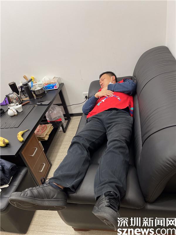1月10日凌晨5點(diǎn)多,桂園街道桂木園社區(qū)黨委書記劉劍從核酸檢測(cè)點(diǎn)回來(lái),躺在辦公室的沙發(fā)上,連身上的紅馬甲都沒(méi)有脫就睡著了。