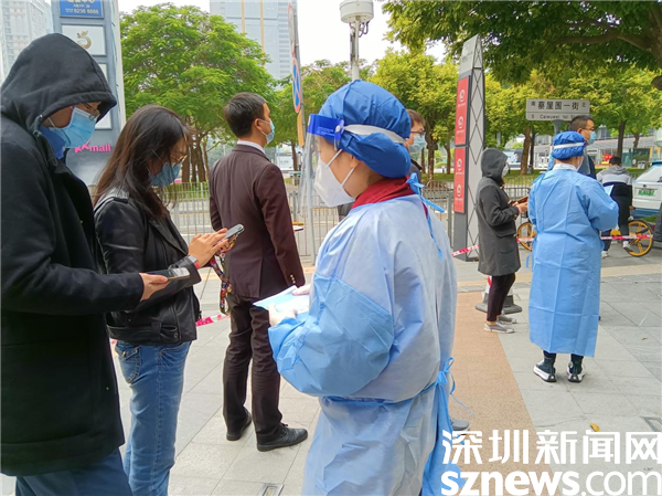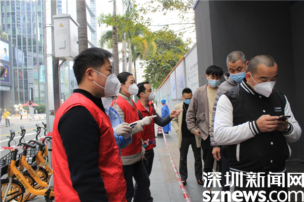 1月14日,深圳市京基智農時代股份有限公司總部黨支部黨委副書記張玲帶領5位黨員,火速來到禧程酒店臨時檢測點,經(jīng)過簡短的培訓,他們集體上崗,各就其位。有的維持秩序,有的在外圍協(xié)助查驗綠碼,有的協(xié)助出示粵酸碼。黃子亮和彭乾偉穿上防護服,現(xiàn)學現(xiàn)做,使用自己的手機為前來采用的市民掃描粵酸碼。他們都是青壯年,雖然這是關鍵崗位,但他們一學就會,很快上手。十人一管,掃碼上傳,有條不紊,忙而不亂。