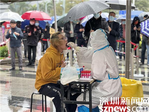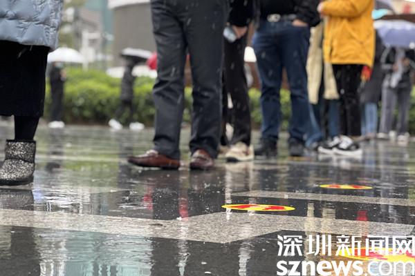 地上是淅瀝瀝的小雨,天氣惡劣,前來開展核酸檢測的市民依然遵守“一米距離”等防疫要求,現(xiàn)場井然有序。