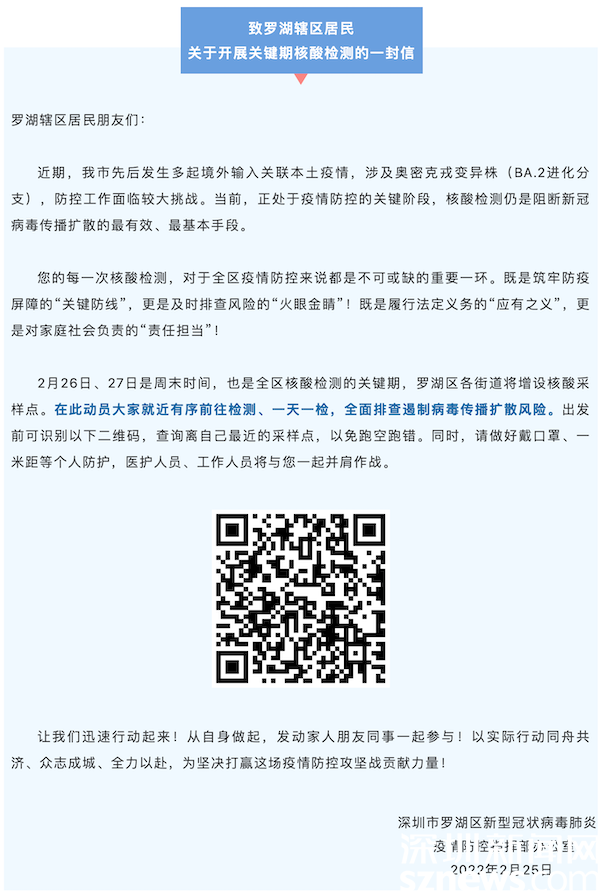 讀特客戶(hù)端·深圳新聞網(wǎng)2022年2月26日訊(記者 覃鈺清)2月25日晚,羅湖區(qū)新型冠狀病毒肺炎疫情防控指揮部辦公室發(fā)出《致羅湖轄區(qū)居民關(guān)于開(kāi)展關(guān)鍵期核酸檢測(cè)的一封信》,該信函指出,本周末(2月26日、27日)是全區(qū)核酸檢測(cè)的關(guān)鍵期,全區(qū)各街道共設(shè)置200個(gè)核酸采樣點(diǎn),動(dòng)員轄區(qū)所有居民就近有序前往檢測(cè)、一天一檢,全面排查遏制病毒傳播擴(kuò)散風(fēng)險(xiǎn)。26日上午,記者前往羅湖區(qū)桂園街道實(shí)地探訪(fǎng)核酸檢測(cè)開(kāi)展情況。