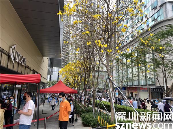 在國速中心廣場,黃花鈴木開得正好,藍天白云下是有序的核酸檢測隊伍,“大白”和“小藍”們正忙碌不停。據(jù)悉,這是桂園街道所屬的松園社區(qū)的一個核酸檢測點,地處于商業(yè)旺區(qū)附近,人口較多,所以核酸檢測隊伍也相對其他核酸檢測點長。羅湖區(qū)政協(xié)委員、深圳市國速房地產(chǎn)開發(fā)有限公司董事長黃少兵表示,這個核酸檢測點從1月初就設(shè)立了,“由于國速中心廣場較寬敞,滿足了通風和人流需求?!?/p>
