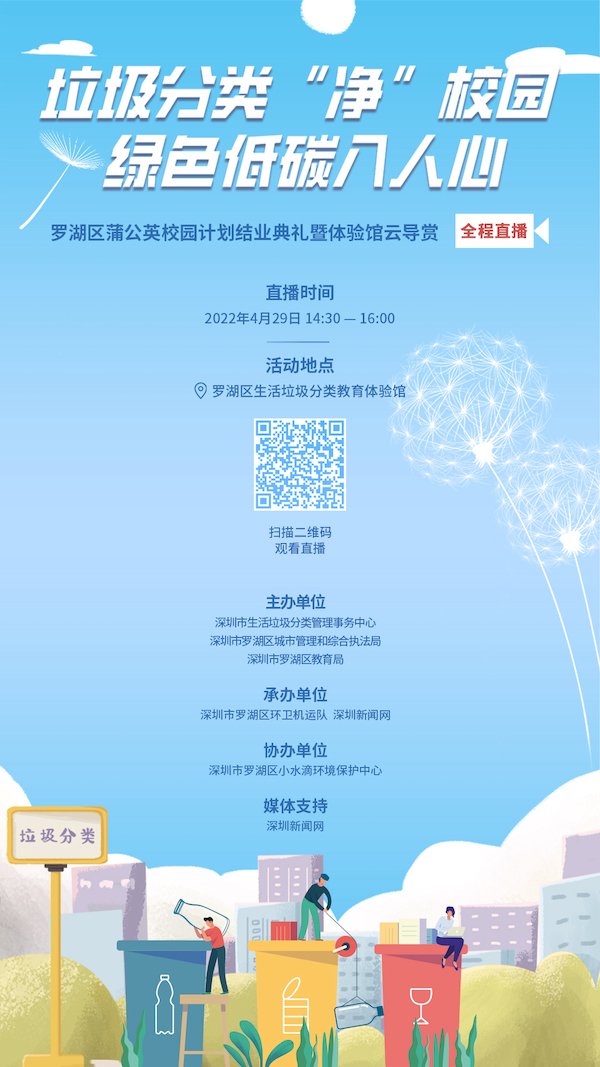 4月29日下午2:30—4:00,羅湖區(qū)首期蒲公英教師培訓迎來結業(yè),羅湖區(qū)垃圾分類體驗館館經(jīng)歷多月重整布展后煥新重開,屆時,深圳市生活垃圾分類管理事務中心、羅湖區(qū)城市管理和綜合執(zhí)法局和羅湖區(qū)教育局共同舉辦垃圾分類“凈”校園綠色低碳入人心——羅湖區(qū)蒲公英校園計劃結業(yè)典禮暨科普館云導賞活動,深圳新聞網(wǎng)將進行全程直播,歡迎各位網(wǎng)友觀看。