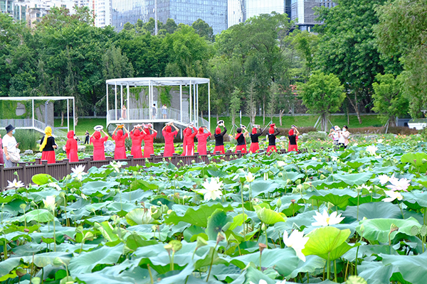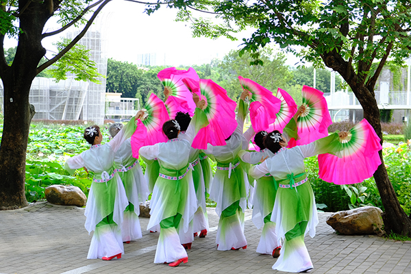 走進(jìn)公園,映入眼簾的是一望無際的荷葉。一陣微風(fēng)拂過,嫩綠的蓮蓬輕輕點頭,碩大的荷葉隨風(fēng)搖擺,讓人心曠神怡。荷塘邊,身著紅色連衣裙的阿姨們正隨著音樂舞動;池塘的另一頭,身著碧綠服裝的阿姨們熱情洋溢地表演著扇子舞。
