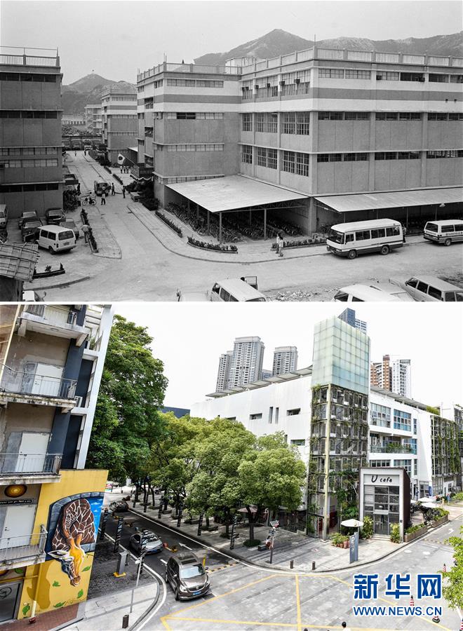 拼版照片:上圖為位于深圳蛇口工業(yè)區(qū)的三洋電機(jī)(蛇口)有限公司廠房外景(資料照片,新華社記者李長(zhǎng)永攝);下圖為2018年6月20日拍攝的原三洋電機(jī)(蛇口)有限公司廠房(新華社記者毛思倩攝)。這些廠房已經(jīng)被打造成為南海意庫(kù)創(chuàng)意產(chǎn)業(yè)園,里面匯聚了咖啡館、服裝店、設(shè)計(jì)工作室等文創(chuàng)項(xiàng)目。新華社發(fā)