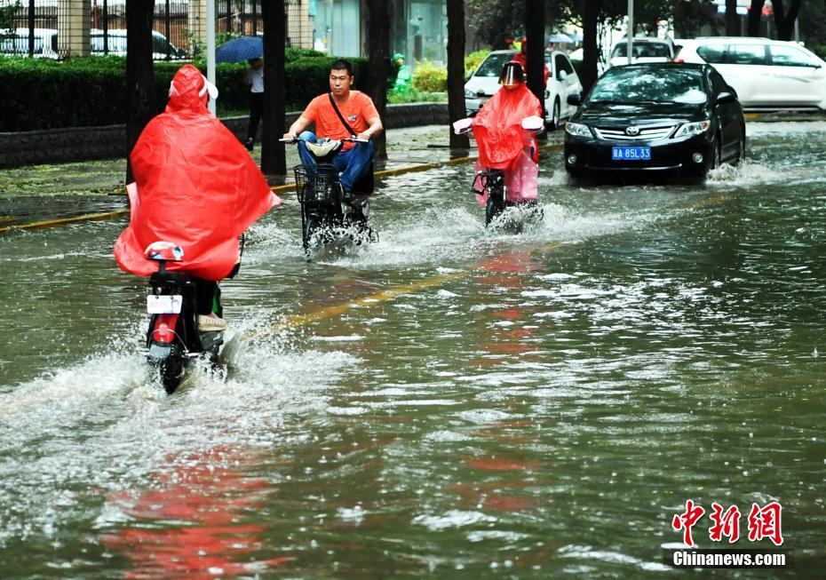 7月16日下午,河北石家莊一條馬路積水嚴(yán)重,民眾涉水騎行。當(dāng)日,該省氣象臺發(fā)布暴雨藍色預(yù)警,承德、雄安新區(qū)、廊坊北部、石家莊中西部、邢臺西部等多地遭受暴雨襲擊。中新社記者翟羽佳 攝